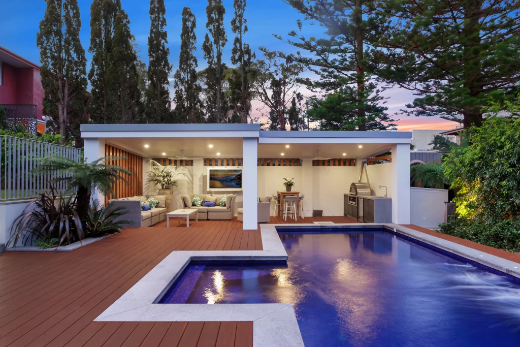 Additional features include a ground-floor media or games room, landscaped grounds with a heated pool, poolside cabana equipped with a pizza oven and television, and secure parking for seven vehicles. The property also includes a wine cellar and lift access to all three levels.